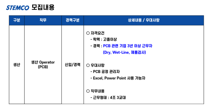 스템코 생산직(생산) 직무 상세 정보