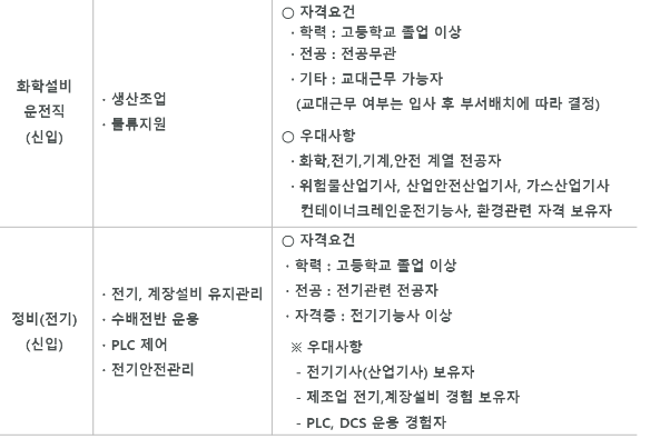 - 우대 조건: 화학/기계 관련 전공, 생산 설비 운영 경험